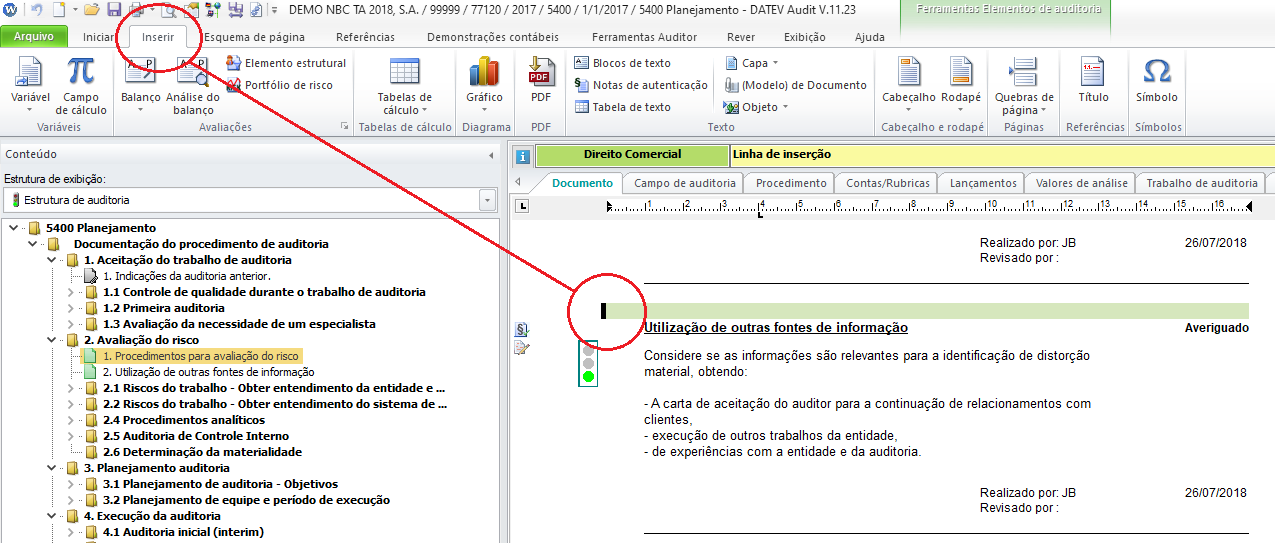 Em qualquer um dos documentos de DATEV Audit, e também nos modelos de documentos, verá que cada elemento está separado pela chamada barra de inserção verde (ou linha).